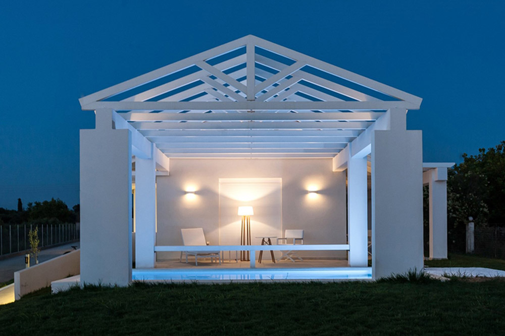 Η σύνθεση χαρακτηρίζεται από καθαρές γραμμές, λευκούς γεωμετρικούς όγκους και ελαφριές ξύλινες κατασκευές που φιλτράρουν το φως, δημιουργώντας ρυθμό και σκιασμένες επιφάνειες.