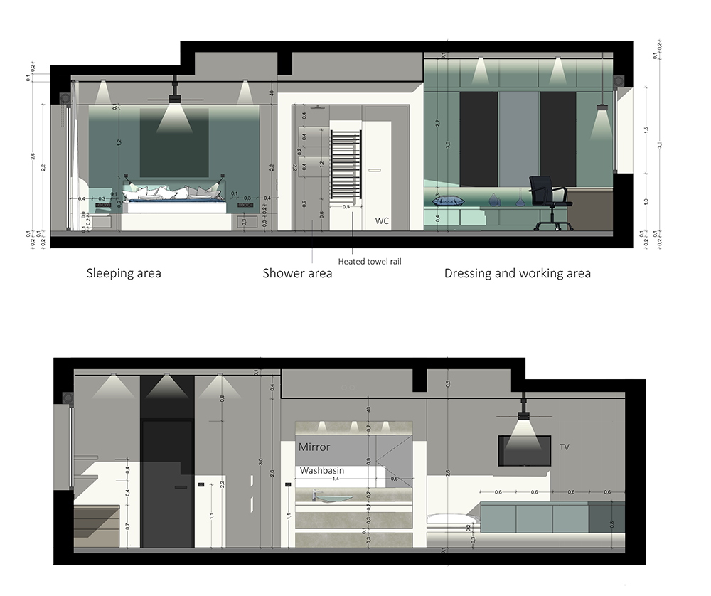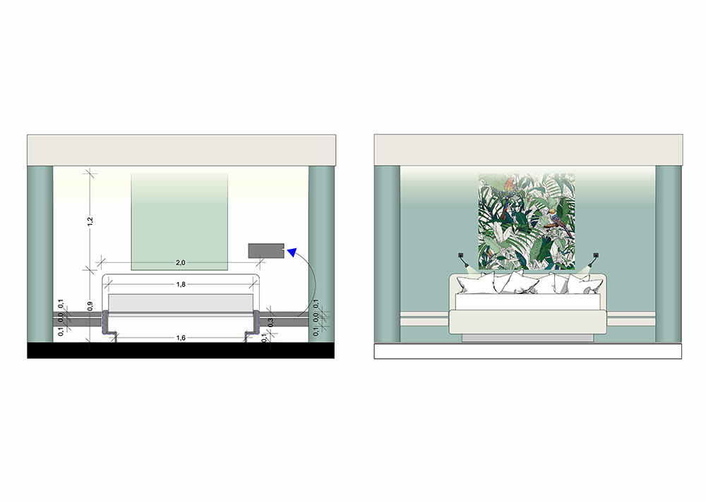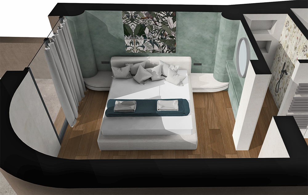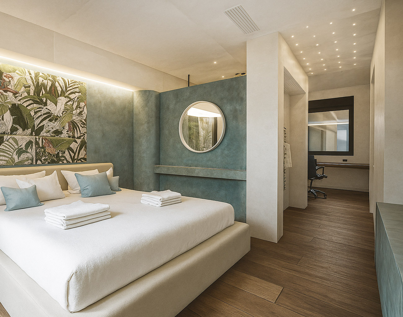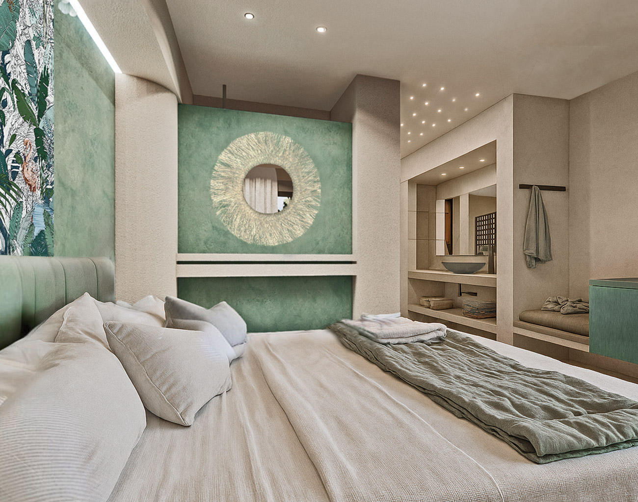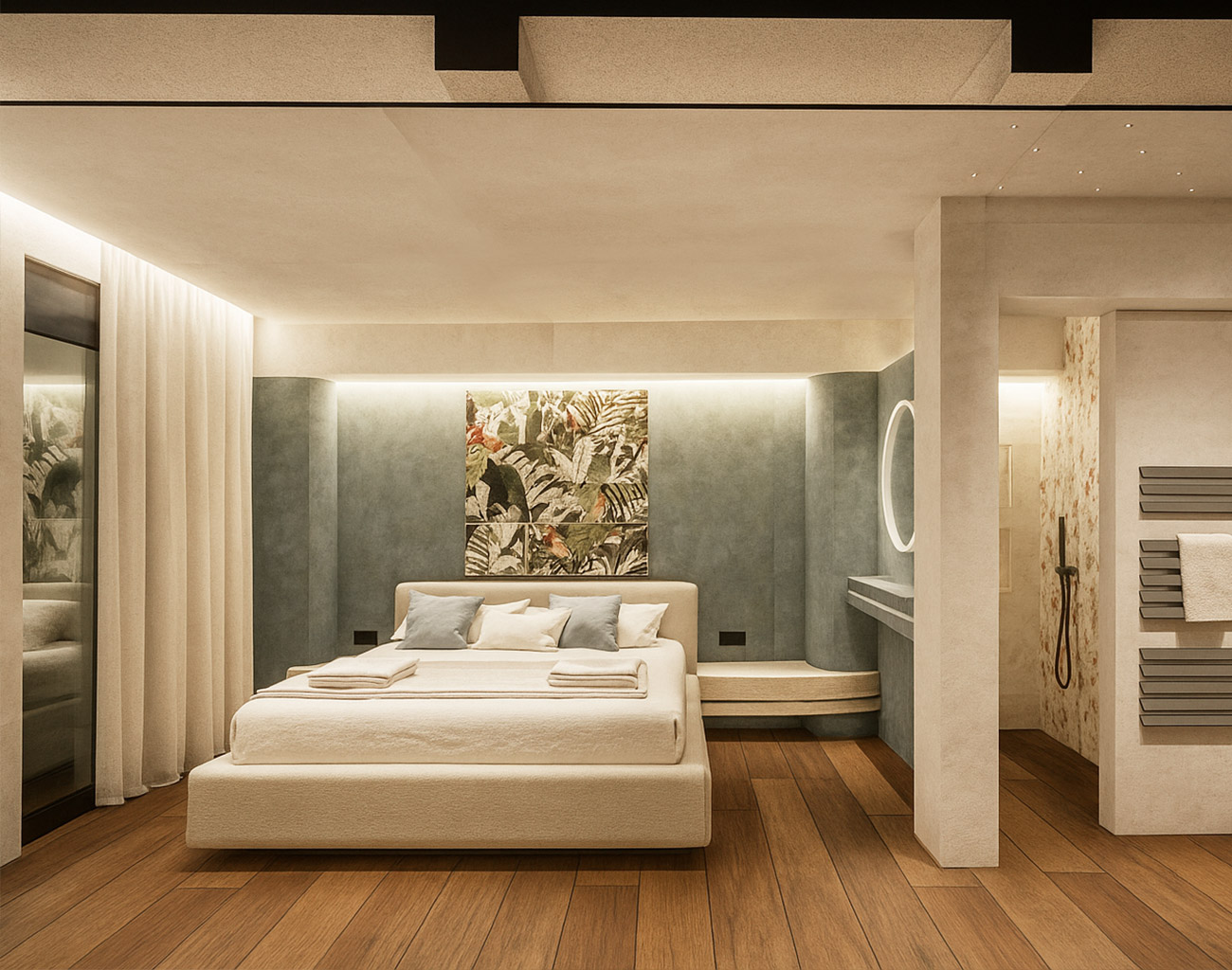 Das Schlafzimmer wurde im Rahmen einer Ferienresidenz entworfen und ist in drei klar definierte Zonen gegliedert, um Funktionalität, Komfort und Privatsphäre zu gewährleisten:
