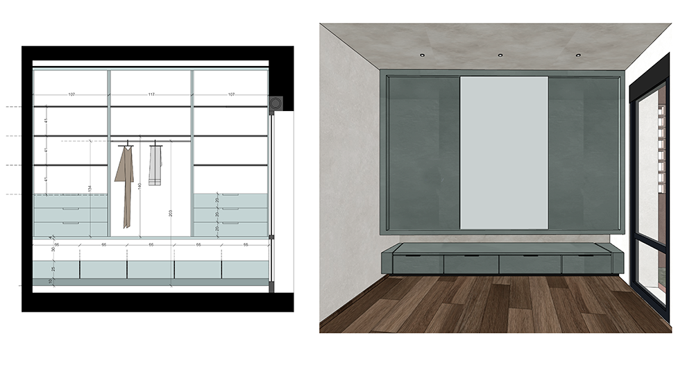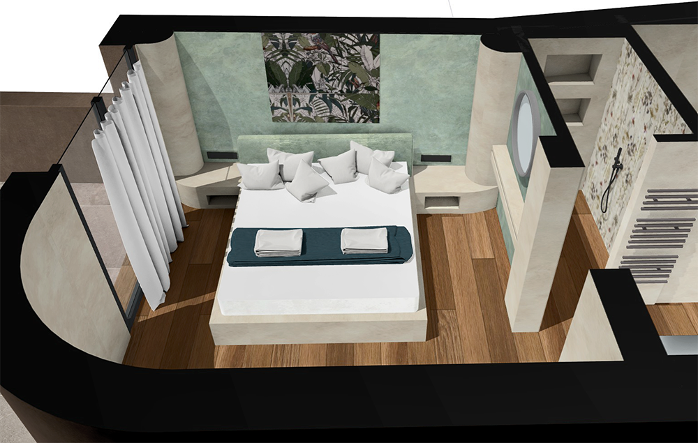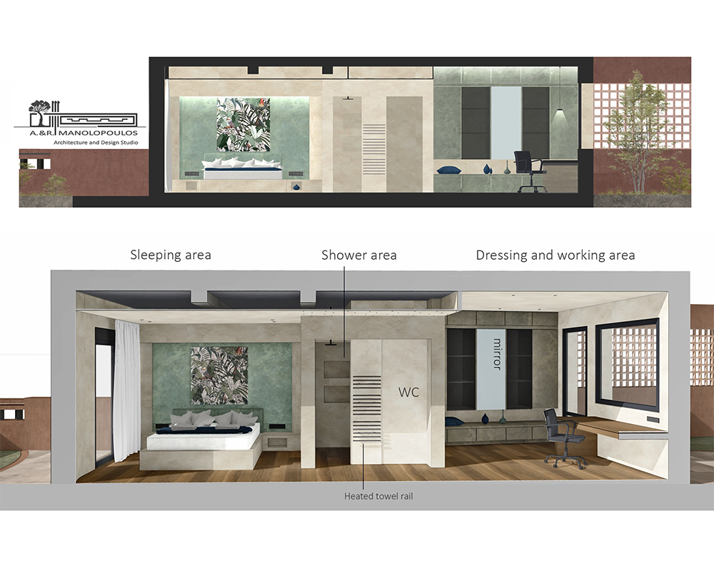 Ο σχεδιασμός του υπνοδωματίου εντάσσεται στο πλαίσιο μιας εξοχικής κατοικίας και οργανώνεται σε τρεις διακριτές ζώνες, με στόχο τη λειτουργικότητα, την άνεση και την ιδιωτικότητα: