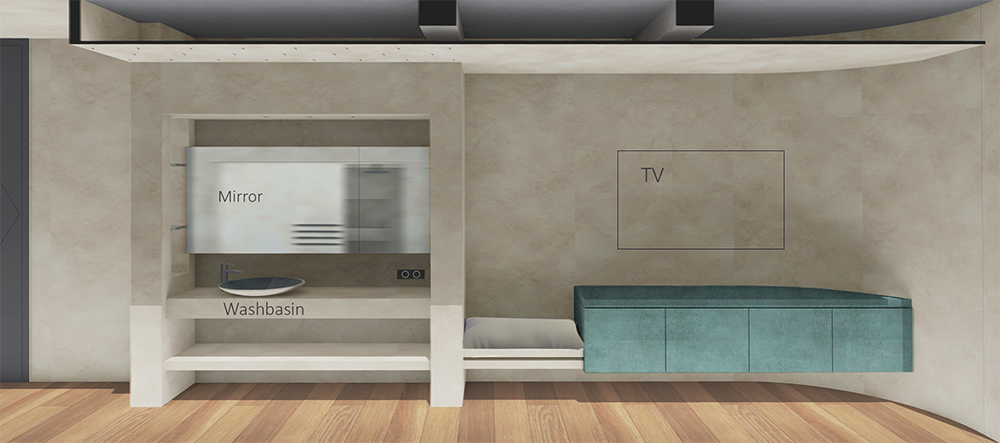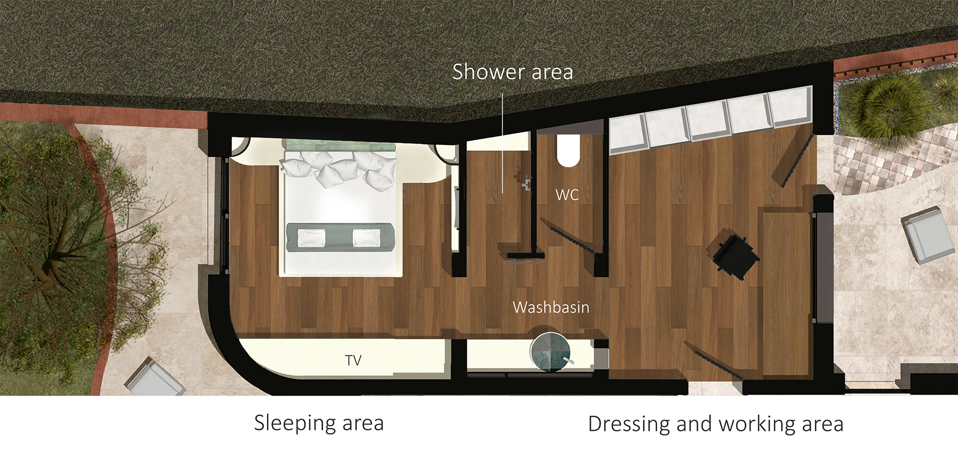 • Λουτρό σε open plan διάταξη, με ανεξάρτητες περιοχές για ντους, WC και νιπτήρα.
